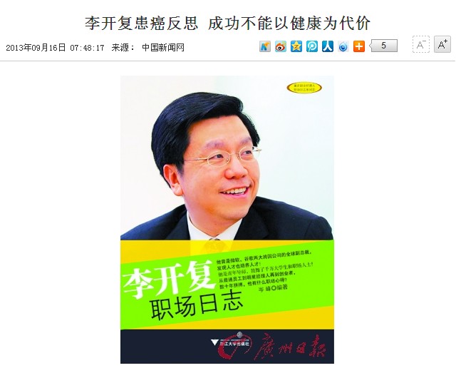 据中国新闻网报道:李开复曾努力把“拼命”作为自己的一个标签。当疾病来“敲门”时他才发现,这种以健康为代价的坚持,不一定是对的。
